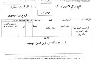 وزارة العمل والتشغيل والضمان الاجتماعي الوكالة الوطنية للتشغيل الفرع الولائي للتشغيل: بسكرة الملحقة المحلية للتشغيل: بسكرة ads عرض عمل بسكرة في 2025/04/20 الهيئة المستخدمةتاريخ التسجيلالعرضمكان العملنوع العقدعدد المناصبالشروط المطلوبةالمؤسسة العمومية للنقل المسافرين بالشرق2025/04/20سائق حافلةبسكرةCDD10السن 30 سنة فما فوق الخبرة 5 سنوات فما فوق ملاحظة: …