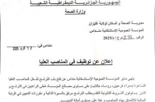 وزارة الصحة مديرية الصحة والسكان لولاية غليزان المؤسسة العمومية الاستشفائية منداس ads إعلان عن توظيف في المناصب العليا ينهي مدير المؤسسة العمومية الاستشفائية منداس عن فتح باب الترشح لشغل المناصب العليا الشاغرة (مدراء فرعيين، رؤساء مكاتب) على مستوى مصالح المؤسسة، فعلى الراغبين في الترشح …