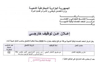 وزارة التضامن الوطني و الأسرة و قضايا المرأةمديرية النشاط الاجتماعي و التضامنالمركز المتعدد الخدمات لوقاية الشباب بورقلة ads إعلان عن توظيف خارجي يعلن المركز المتعدد الخدمات لوقاية الشباب بورقلة عن فتح توظيف بعنوان سنة 2025 بصفة تعاقدية للالتحاق بمناصب الشغل المبينة أدناه: المنصب المطلوبنمط …