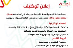إعلان توظيف ads يعلن المركز التجاري الواحة للتسوق عن رغبته في توظيف عمال نظافة (ذكور وإناث) للعمل ضمن فريقه في الواحة للتسوق فرع الرويبة. المهام الوظيفية تنظيف المساحات والمكاتب والمرافق وفق معايير النظافة والسلامة. المحافظة على الأدوات والمعدات الخاصة بالنظافة. التعاون مع الفريق والالتزام …