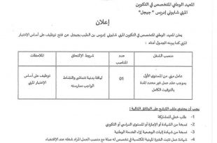 وزارة الصحة معهد التكوين شبه الطبي 1 ads إعلان عن فتح توظيف يعلن معهد التكوين شبه الطبي 1 بالجلفة عن فتح مسابقة توظيف على أساس الاختبارات للالتحاق بالمناصب المبينة أدناه : يجب أن يحتوي ملف المترشح على الوثائق التالية : طلب خطي للمشاركة في …