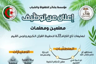 مؤسسة بشائر للطفولة والشباب إعلان عن توظيف معلمين ومعلمات ads لمخيمات تاج الكرام 19 لتحفيظ القرآن الكريم وغرس القيم المتطلبات مستظهر أو خاتم لكتاب الله. متقن لأحكام التلاوة برواية ورش عن نافع. ذو خبرة في التعليم. الجِدّة والانضباط. الفترة: من 21 جوان إلى 01 …