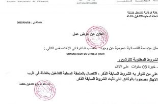 الوكالة الولائية للتشغيل خنشلة الملحقة المحلية للتشغيل خنشلة خنشلة في: 2025/04/09 إعلان عن عرض عمل ads تعلن مؤسسة اقتصادية عمومية عن وجود منصب شاغر في الاختصاص التالي: CONDUCTEUR DE GRUE A TOUR الشروط المطلوبة للترشح: خبرة 03 سنوات على الأقل على من تتوفر فيه …