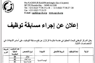 وزارة السكن والعمران والمدينة والتهيئة العمرانية المركز الوطني للبحث المطبق في هندسة مقاومة الزلازل ads اعلان عن توظيف المركز الوطني للبحث المطبق في هندسة مقاومة الزلازل يعلن عن فتح مسابقات توظيف في التخصصات التالية: استاذ بحث صنف ب – 20 – مهندس دولة لدعم …