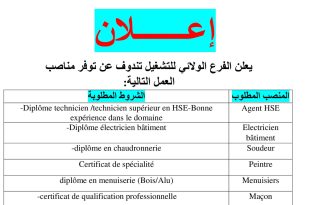 إعلان ads يعلن الفرع الولائي للتشغيل تندوف عن توفر مناصب العمل التالية: المنصب المطلوبالشروط المطلوبةAgent HSEDiplôme technicien / technicien supérieur en HSE – Bonne expérience dans le domaineElectricien bâtimentDiplôme électricien bâtimentSoudeurdiplôme en chaudronneriePeintreCertificat de spécialitéMenuisiersdiplôme en menuiserie (Bois/Alu)Maçoncertificat de qualification professionnelleOuvriers de découpe des …