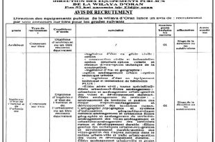 أكمل القراءة »إعلان عن توظيف بمديرية التجهيزات العمومية لولاية وهران