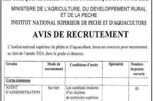 الجمهورية الجزائرية الديمقراطية الشعبية وزارة الفلاحة والتنمية الريفية والصيد البحري المعهد الوطني العالي للصيد البحري وتربية المائيات ads إعلان عن مسابقة توظيف يعلن المعهد الوطني العالي للصيد البحري وتربية المائيات باش جراح بالجزائر العاصمة عن تنظيم مسابقة للتوظيف برسم سنة 2024، لشغل منصب واحد …