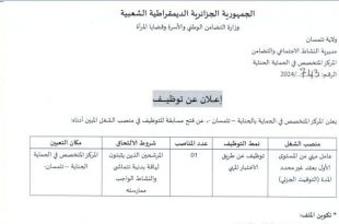 الجمهورية الجزائرية الديمقراطية الشعبية وزارة التضامن الوطني والأسرة وقضايا المرأة ولاية تلمسان مديرية النشاط الاجتماعي والتضامن المركز المتخصص في الحماية الحناية ads إعلان عن توظيف يعلن المركز المتخصص في الحماية بالحناية – تلمسان – عن فتح مسابقة للتوظيف في منصب الشغل المبين أدناه: منصب …