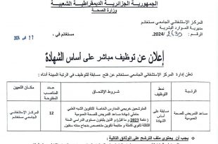 أكمل القراءة »إعلان عن توظيف مباشر على أساس الشهادة بالمركز الاستشفائي الجامعي مستغانم