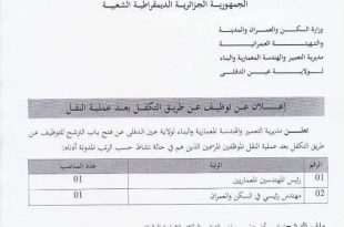 وزارة السكن والعمران والمدينة والتهيئة العمرانية مديرية التعمير والهندسة المعمارية والبناء لولاية عين الدفلى ads إعلان توظيف عن طريق التكفل بعد عملية النقل تعلن مديرية التعمير والهندسة المعمارية والبناء لولاية عين الدفلى عن فتح باب الترشح للتوظيف عن طريق التكفل بعد عملية النقل للموظفين …