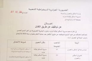 إعلان توظيف عن طريق النقل بمديرية السكن لولاية تيارت