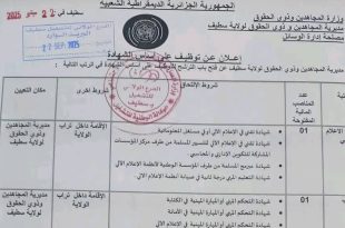 وزارة المجاهدين وذوي الحقوق مديرية المجاهدين وذوي الحقوق لولاية سطيف ads إعلان عن توظيف على أساس الشهادة تعلن مديرية المجاهدين وذوي الحقوق لولاية سطيف عن فتح باب الترشيح للتوظيف على أساس الشهادة في الرتب التالية: الرتبةعدد المناصب المالية المفتوحةشروط الالتحاقالفرز الأولي والترتيب النهائي للمتأهلينشروط …
