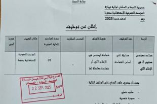 وزارة العمل والتشغيل والضمان الاجتماعي الوكالة الوطنية للتشغيل الفرع الولائي للتشغيل قسنطينة الملحقة المحلية للتشغيل قايس ads قايس في: 14 / 09 / 2025 إعلان عن عرض عمل تعلن شركة كوسيدار T162 بوحامة بمشروع إنجاز سد واد لزرق عن توفر المناصب: 05 مناصب عمل …