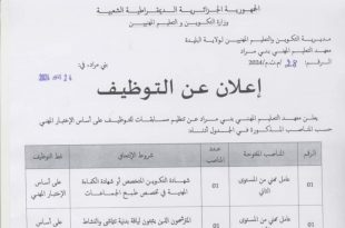 الجمهورية الجزائرية الديمقراطية الشعبية وزارة التكوين والتعليم المهنيين مديرية التكوين والتعليم المهنيين لولاية البليدة معهد التعليم المهني بني مراد ads إعلان عن توظيف يعلن معهد التعليم المهني بني مراد عن تنظيم مسابقات للتوظيف على أساس الاختبار المهني حسب المناصب المذكورة في الجدول أدناه: جميع …