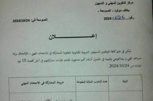 الجمهورية الجزائرية الديمقراطية الشعبية وزارة التكوين والتعليم المهنيين مديرية التكوين والتعليم المهنيين لولاية البليدة مركز التكوين المهني والتمهين يخلف مولود الصومعة تاريخ: 2024/10/24 ads إعلان ليكن الى علم كافة الموظفين المستوفين الشروط القانونية المطلوبة للمشاركة في الامتحان المهني للإلتحاق برتبة مساعد تقني وبيداغوجي، المبينة …