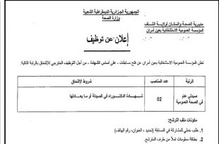 الجمهورية الجزائرية الديمقراطية الشعبية وزارة الصحة مديرية الصحة والسكان لولاية الشلف المؤسسة العمومية الاستشفائية بعين أمران ads إعلان عن توظيف تعلن المؤسسة العمومية الاستشفائية بعين أمران عن فتح مسابقات – على أساس الشهادة – من أجل التوظيف الخارجي للإلتحاق بالرتبة التالية: جميع مسابقات وإعلانات …