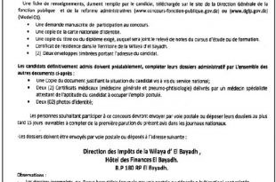 إعلان عن مسابقة توظيف وزارة المالية – الجمهورية الجزائرية الديمقراطية الشعبية المديرية العامة للضرائب المديرية الجهوية للضرائب بشار ads مديرية الضرائب بالبيض تعلن مديرية الضرائب بولاية البيض عن فتح مسابقة للتوظيف لشغل مناصب: مراقب ضرائب مفتش رئيسي للضرائب ملف الترشح: يجب أن يتضمن ملف …