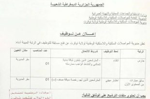الجمهورية الجزائرية الديمقراطية الشعبية وزارة الداخلية والجماعات المحلية والتهيئة العمرانية المديرية العامة للمواصلات السلكية واللاسلكية الوطنية مديرية المواصلات السلكية واللاسلكية الوطنية لولاية توقرت ads إعلان عن توظيف تعلن مديرية المواصلات السلكية واللاسلكية الوطنية لولاية توقرت عن فتح مسابقة للتوظيف في الرتبة المبينة أدناه: جميع …