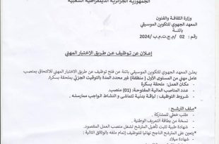 أكمل القراءة »إعلان عن توظيف عن طريق الاختبار المهني بالمعهد الجهوي للتكوين الموسيقي باتنة