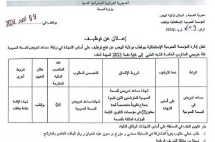 الجمهورية الجزائرية الديمقراطية الشعبية وزارة الصحة مديرية الصحة والسكان لولاية البيض المؤسسة العمومية الإستشفائية بوقطب بوقطب في 09 أكتوبر 2024 ads إعلان عن توظيف تعلن إدارة المؤسسة العمومية الإستشفائية ببوقطب بولاية البيض عن فتح توظيف على أساس الشهادة في رتبة مساعد تمريض للصحة العمومية …