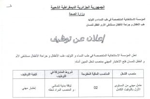 أكمل القراءة »إعلان عن توظيف بالمؤسسة الاستشفائية المتخصصة في طب النساء والتوليد، طب الأطفال وجراحة الأطفال مستشفى الأم والطفل تلمسان