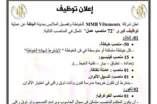 إعلان توظيف ads تعلن شركة MMB Vêtements المتخصصة في مجال الخياطة والتفصيل بمدينة الجلفة عن حاجتها إلى 72 عاملاً عاملة للعمل في ورشاتها. الوظائف الشاغرة: للإناث: 50 منصب: خياطة (يشترط إتقان الخياطة بشكل جيد أو متوسط). 15 منصب: فينيسيو (حدادة، تطباق، بيار، تقنية الخيط،…). …
