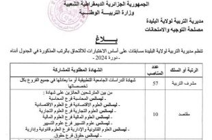 الجمهورية الجزائرية الديمقراطية الشعبية وزارة التربية الوطنة الديوان الوطني للامتحانات والمسابقات اعلان ads جدول توزيع المناصب المالية المخصصة للمسابقات على اساس الاختبارات بعنوان سنة 2024 جميع مسابقات وإعلانات التوظيف نوفمبر 2025 إعلان عن مسابقة توظيف بالمعهد التقني لزراعة البقول والزراعات الصناعية بالجزائر العاصمة ووهران …