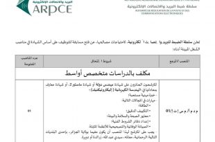 إعلان عن توظيف سلطة ضبط البريد والاتصالات الإلكترونية ads تعلن سلطة ضبط البريد والاتصالات الإلكترونية، لاحتياجات مصالحها، عن فتح مسابقة للتوظيف على أساس الشهادة في مناصب الشغل المبينة أدناه: : المنصب /المرجعشروط الالتحاقعدد المناصب المالية المفتوحةمكلف بالدراسات متخصص أواسطم د م أ/ م س …