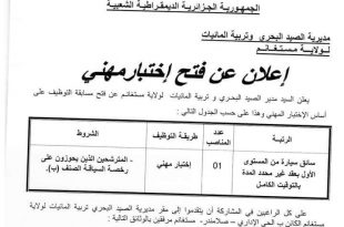 الجمهورية الجزائرية الديمقراطية الشعبية وزارة الصيد البحري وتربية المائيات مديرية الصيد البحري وتربية المائيات لولاية مستغانم ads إعلان عن توظيف يعلن مدير الصيد البحري وتربية المائيات لولاية مستغانم عن فتح مسابقة التوظيف على أساس الإختبار المهني وهذا على حسب التالي: الشروططريقة التوظيفالرتبةالمناصبالمترشحون الذين يحوزون …