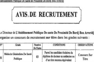 إعلان عن توظيف بالمؤسسة العمومية للصحة الجوارية برج بوعريريج