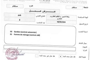 عرض عمل ads الهيئة المعنية: وكالة التسيير والتنظيم العقاري والحضري تاريخ الإعلان: 08/09/2024 الوظائف الشاغرة: حارس: عقد موسمي (عدد الوظائف: 2) عاملة نظافة: عقد محدد المدة (عدد الوظائف: 1) جميع مسابقات وإعلانات التوظيف نوفمبر 2025 إعلان عن مسابقة توظيف بالمعهد التقني لزراعة البقول والزراعات …