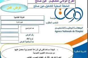 الجمهورية الجزائرية الديمقراطية الشعبية الوكالة الوطنية للتشغيل فرع ولاية عين صالح الملحقة المحلية للتشغيل عين صالح عـرض عـمـل ads المؤسسة المعنية: الغرفة الفلاحية المنصب المطلوب: عون إدارة الشروط المطلوبة: شهادة مساعد تقني في الزراعة الصحراوية محصل عليها من مؤسسات التكوين العمومي. الخبرة: 02 على …