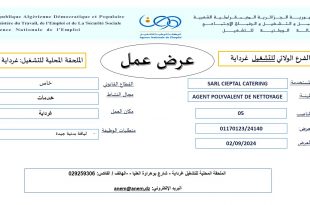 الجمهورية الجزائرية الديمقراطية الشعبية وزارة العمل والتشغيل والضمان الاجتماعي الوكالة الوطنية للتشغيل ads عـرض عـمـل الفرع الولائي للتشغيل غرداية الملحقة المحلية للتشغيل غرداية الجهة المستخدمة: SARL CIEPTAL CATERING مجال النشاط: خدمات المناصب: عامل متعدد المهام في النظافة مكان العمل: غرداية عدد المناصب: 05 رقم …