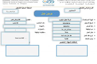 الجمهورية الجزائرية الديمقراطية الشعبية وزارة العمل والتشغيل والضمان الاجتماع يالوكالة الوطنية للتشغيل ads الملحقة المحلية للتشغيل تيسمسيلت، الفرع الولائي للتشغيل تيسمسيلت. عرض عمل الهيئة المستخدمة: الجزائرية للمياه القطاع: عام وطني تاريخ التسجيل: 03/09/2024 المنصب المطلوب: ميكانيكي عدد المناصب: 01 مجال النشاط: خدمات شروط المنصب: …