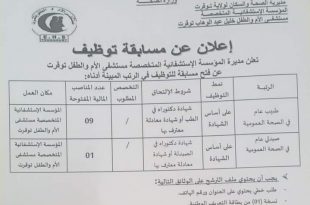 إعلان عن توظيف المؤسسة الاستشفائية المتخصصة مستشفى الأم والطفل بتوفرت ads تعلنم المؤسسة الاستشفائية المتخصصة مستشفى الأم والطفل بتوفرت عن فتح نوظيف في الرتب التالية: طبيب عام: 9 وظائف شاغرة. الشروط: شهادة دكتوراه في الطب أو ما يعادلها. صيدلي عام: 1 وظيفة شاغرة واحدة. …