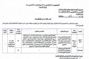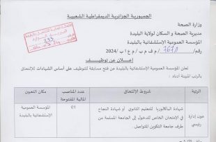 الجمهورية الجزائرية الديمقراطية الشعبية وزارة الصحة مديرية الصحة والسكان لولاية البليدة المؤسسة العمومية الإستشفائية بالبليدة ads إعلان عن توظيف تعلن المؤسسة العمومية الإستشفائية بالبليدة عن فتح مسابقة للتوظيف على أساس الشهادات للإلتحاق بالرتب المبينة أدناه: ملف الترشح: طلب خطي للمشاركة في المسابقة 02 صور …