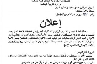 الجمهورية الجزائرية الديمقراطية الشعبية وزارة التربية الوطنية الديوان الوطني لمحو الأمية وتعليم الكبار ملحقة ولاية سكيكدة إعلان ads طبقاً للمادة 04 من القرار الوزاري المشترك المؤرخ في 2008/05/06 الذي يحدد كيفيات توظيف الأعوان المتعاقدين المكلفين بمحو الأمية، تعلن ملحقة الديوان الوطني لمحو الأمية وتعليم …