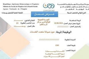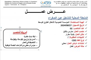 الجمهورية الجزائرية الديمقراطية الشعبية وزارة العمل والتشغيل والضمان الاجتماعي الوكالة الوطنية للتشغيل الملحقة المحلية للتشغيل بوسعادة الفرع الولائي للتشغيل المسيلة ads عرض عمل الهيئة المستخدمة: المؤسسة العمومية الولائية لتسيير مراكز الردم التقني القطاع القانوني: عام عدد المناصب المطلوبة: 01 تاريخ تسجيل عرض العمل: 26/08/2024 …