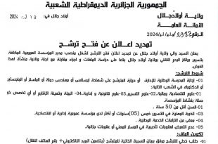 الجمهورية الجزائرية الديمقراطية الشعبية ولاية أولاد جلال تمديد إعلان عن فتح ترشح ads يعلن السيد والي ولاية أولاد جلال عن تمديد إعلان فتح الترشح لشغل منصب مدير المؤسسة العمومية المكلفة بتسيير مراكز الردم التقني بولاية أولاد جلال بناءً على دراسة الملفات وإجراء مقابلة مع …