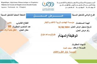 الجمهورية الجزائرية الديمقراطية الشعبية وزارة العمل والتشغيل والضمان الاجتماعي الوكالة الوطنية للتشغيل الملحقة المحلية للتشغيل المسيلة الفرع الولائي للتشغيل المسيلة ads عرض عمل الهيئة المستخدمة: مؤسسة الهضاب لتربية الأغنام والأبقار القطاع القانوني: خاص عدد المناصب المطلوبة: 02 تاريخ تسجيل عرض العمل: 18/08/2024 مكان العمل: …