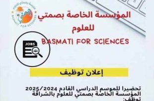 إعلان توظيف المؤسسة الخاصة بصمتي للعلوم ads تحضيراً للموسم الدراسي القادم 2025/2024 توظف: أساتذة الطور الابتدائي: اللغة العربية + اللغة الفرنسية + اللغة الإنجليزية. أساتذة الطور المتوسط: جميع المواد. مساعدون تربويون وإداريون. مختصي النظافة. شروط التوظيف: اللباس المحتشم. الخبرة مطلوبة. حسن المعاملة والتواصل. الالتزام …