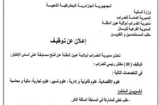 الجمهورية الجزائرية الديمقراطية الشعبيةوزارة الماليةالمديرية العامة للضرائبمديرية الضرائب لولاية عين الدفلىالمديرية الفرعية للوسائلمكتب المستخدمين والتكوين ads إعلان عن توظيف تعلن مديرية الضرائب لولاية عين الدفلى عن فتح مسابقة على أساس الاختبار لتوظيف (09) مفتش رئيسي للضرائب في التخصصات التالية: علوم الاقتصادية علوم قانونية وإدارية …