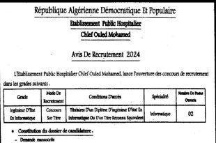 الجمهورية الجزائرية الديمقراطية الشعبية المؤسسة العمومية الاستشفائية الشلف أولاد محمد إعلان عن توظيف 2024 ads تعلن المؤسسة العمومية الاستشفائية الشلف أولاد محمد عن فتح مسابقات توظيف في الرتب التالية: مهندس دولة في الاعلام الالي الشروط: حاصل على شهادة مهندس دولة في الاعلام الالي أو …