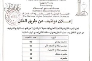 الجمهورية الجزائرية الديمقراطية الشعبية رئاسة الجمهورية المدرسة الوطنية العليا للعلوم الإسلامية “دار القرآن” إعلان توظيف عن طريق النقل ads تعلن المدرسة الوطنية العليا للعلوم الإسلامية “دار القرآن” عن فتح باب الترشح للتوظيف عن طريق التكفل بعد عملية النقل بعنوان سنة 2024 في إحدى الرتب …