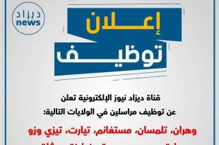 ديزاد نيوز إعلان توظيف ads قناة ديزاد نيوز الإلكترونية تعلن عن توظيف مراسلين في الولايات التالية: وهران، تلمسان، مستغانم، تيارت، تيزي وزو، بجاية، برج بوعريريج، قسنطينة، ورقلة. يرجى إرسال السير الذاتية عبر البريد الإلكتروني: [email protected] جميع مسابقات وإعلانات التوظيف نوفمبر 2025 إعلان عن مسابقة …