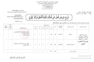 الجمهورية الجزائرية الديمقراطية الشعبية وزارة العمل والتشغيل والضمان الاجتماعي الوكالة الوطنية للتشغيل ads إليزي في 2014-08-01 إلى السيد / والي ولاية إيليزي . ( عرض حال). الفرع الولائي للتشغيل إيليزي الرقم : 24/382 للمتابعة السادة : رؤساء مكاتب التشغيل بلديات الولاية. توزيع عروض العمل …