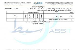 الجمهورية الجزائرية الديمقراطية الشعبية وزارة العمل والتشغيل والضمان الاجتماعي الوكالة الوطنية للتشغيل الفرع الولائي للتشغيل تلمسان الملحقة المحلية للتشغيل تلمسان ads عرض عمل OFFRE D’EMPLOI الهيئة المستخدمة: ETS BOUARICHE GHALEM القطاع القانوني: خاص عدد المناصب: 41 تاريخ التسجيل: 25/07/2024 المناصب المطلوبة: في الصور ادناه …