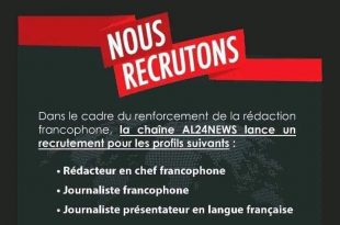 اعلان توظيف ads في إطار تعزيز التحرير باللغة الفرنسية، تطلق قناة AL24NEWS عملية توظيف للمهارات التالية: رئيس تحرير ناطق بالفرنسية صحفي ناطق بالفرنسية صحفي مقدم باللغة الفرنسية أرسل سيرتك الذاتية إلى العنوان التالي: [email protected] AL24 NEWS قناة الجزائر الدولية www.AL24NEWS.com جميع مسابقات وإعلانات التوظيف …