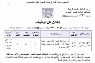 الجمهورية الجزائرية الديمقراطية الشعبية وزارة الفلاحة والتنمية الريفية المحافظة السامية لتطوير السهوب الجلفة إعلان عن توظيف ads تعلن المحافظة السامية لتطوير السهوب عن فتح مسابقة التوظيف بعنوان 2024 للإلتحاق بمنصب الشغل المبين أدناه: المرتبةالمكان الجغرافيعدد المناصبالشروط الأخرىنمط التوظيفسائقسيدي عيش (عين البيضاء) و وادي زمور …