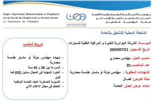 الوكالة الوطنية للتشغيل الملحقة المحلية للتشغيل بالنعامة الشركة الجزائرية للخبرة والمراقبة التقنية للسيارات. ads تاريخ التسجيل: 21 جويلية 2024 مكان العمل: النعامة، الجزائر عدد المناصب: 1 الشهادات المطلوبة: شهادة مهندس دولة أو ماستر هندسة معمارية. الشروط: السن: ما بين 30 و 45 سنة. خبرة …